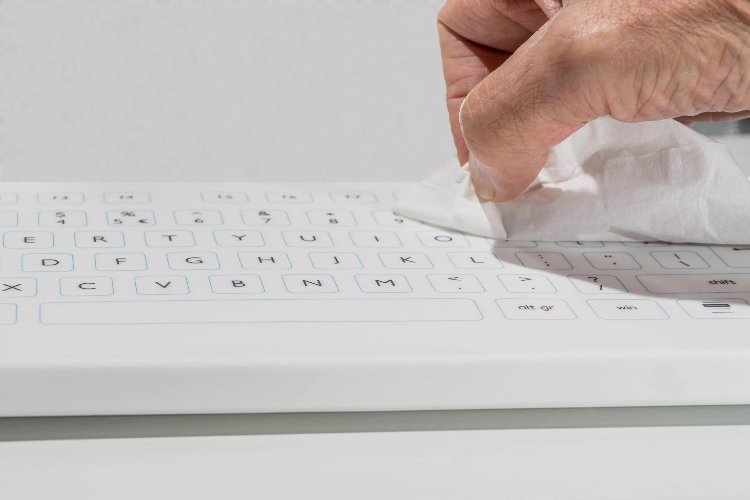 PUREKEYS keyboards are unbreakable, lightweight, robust, impervious to liquids and have no gaps between keys, so they can be cleaned in seconds with any conventional disinfectant by simply wiping them clean – saving time, money and nerves.